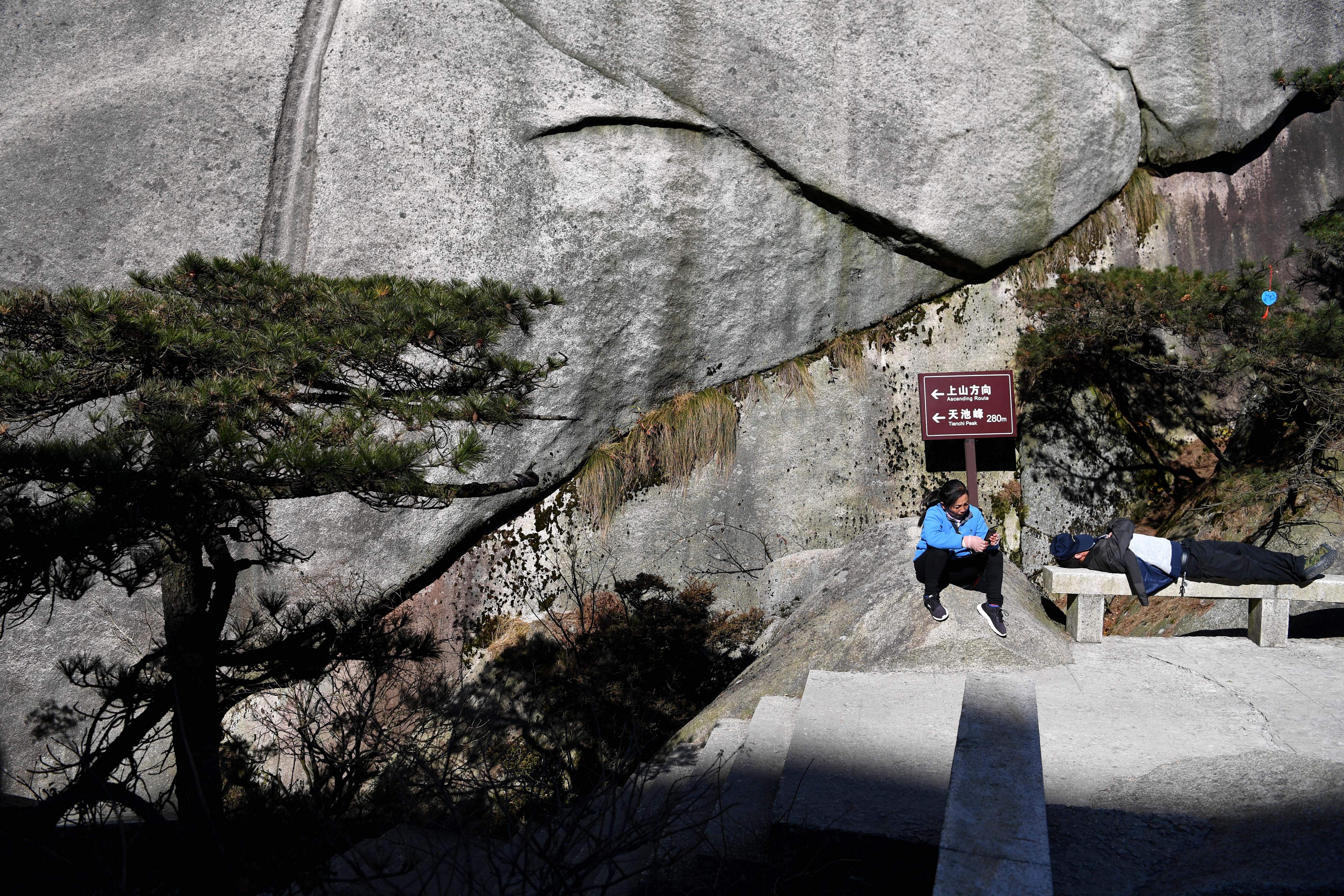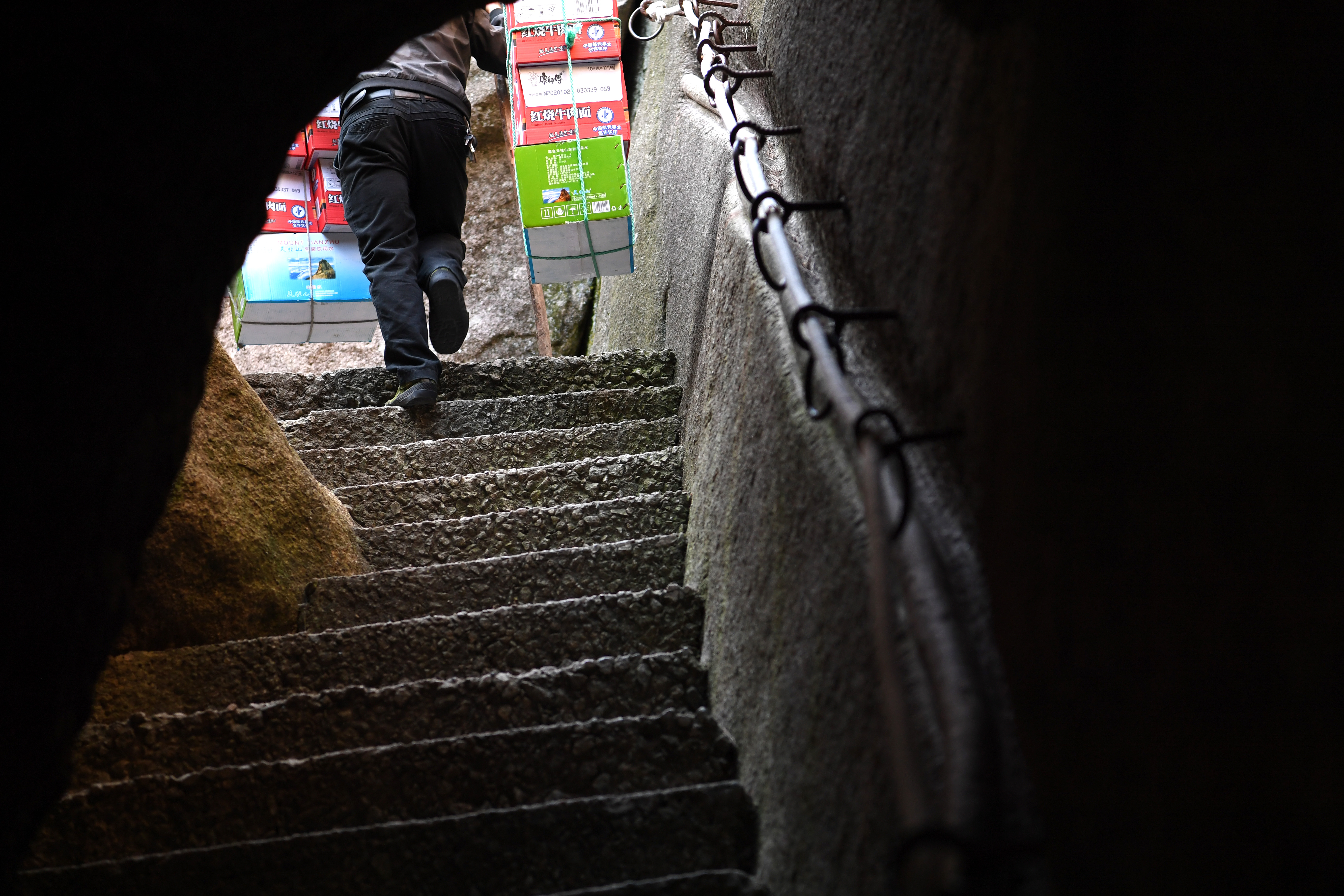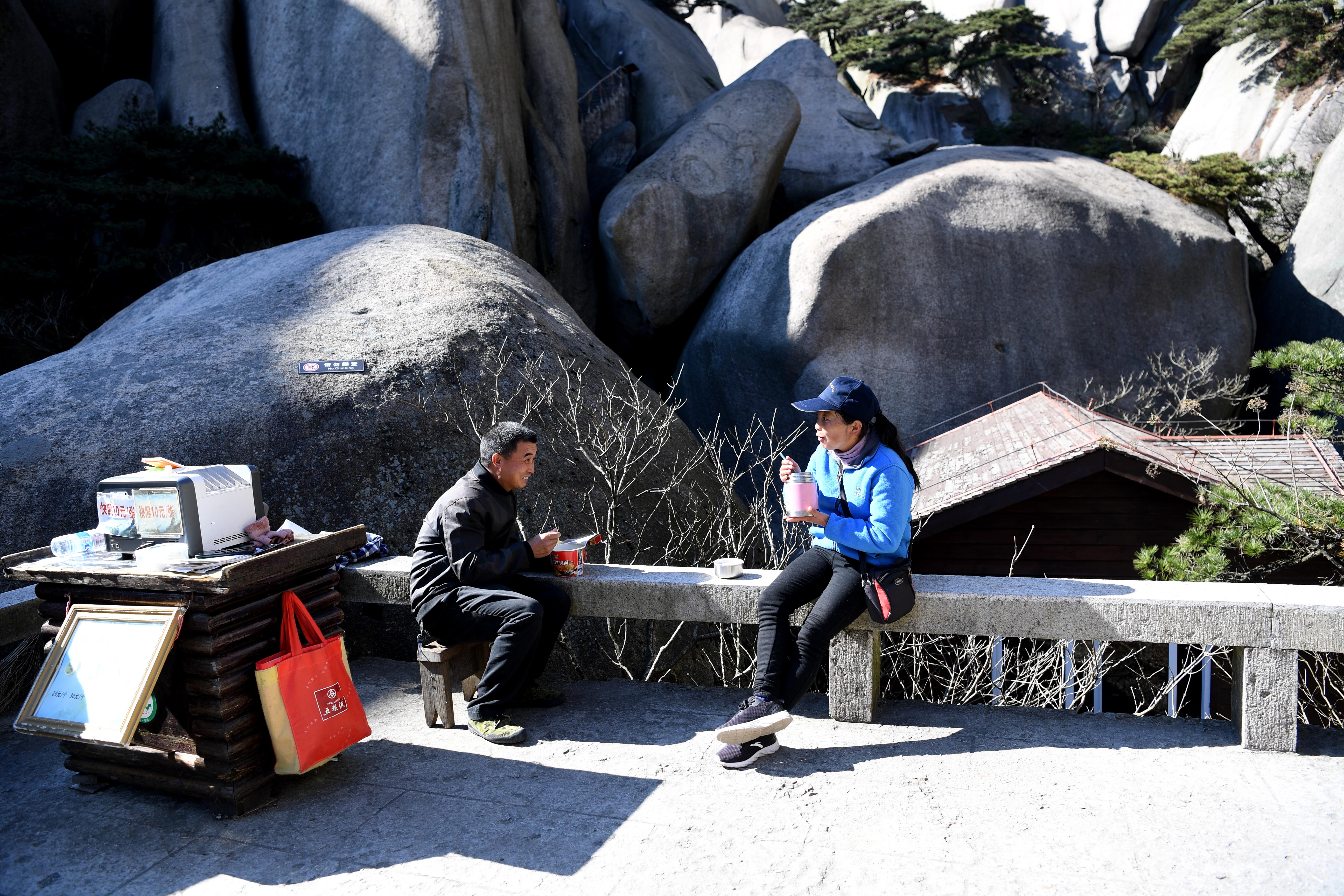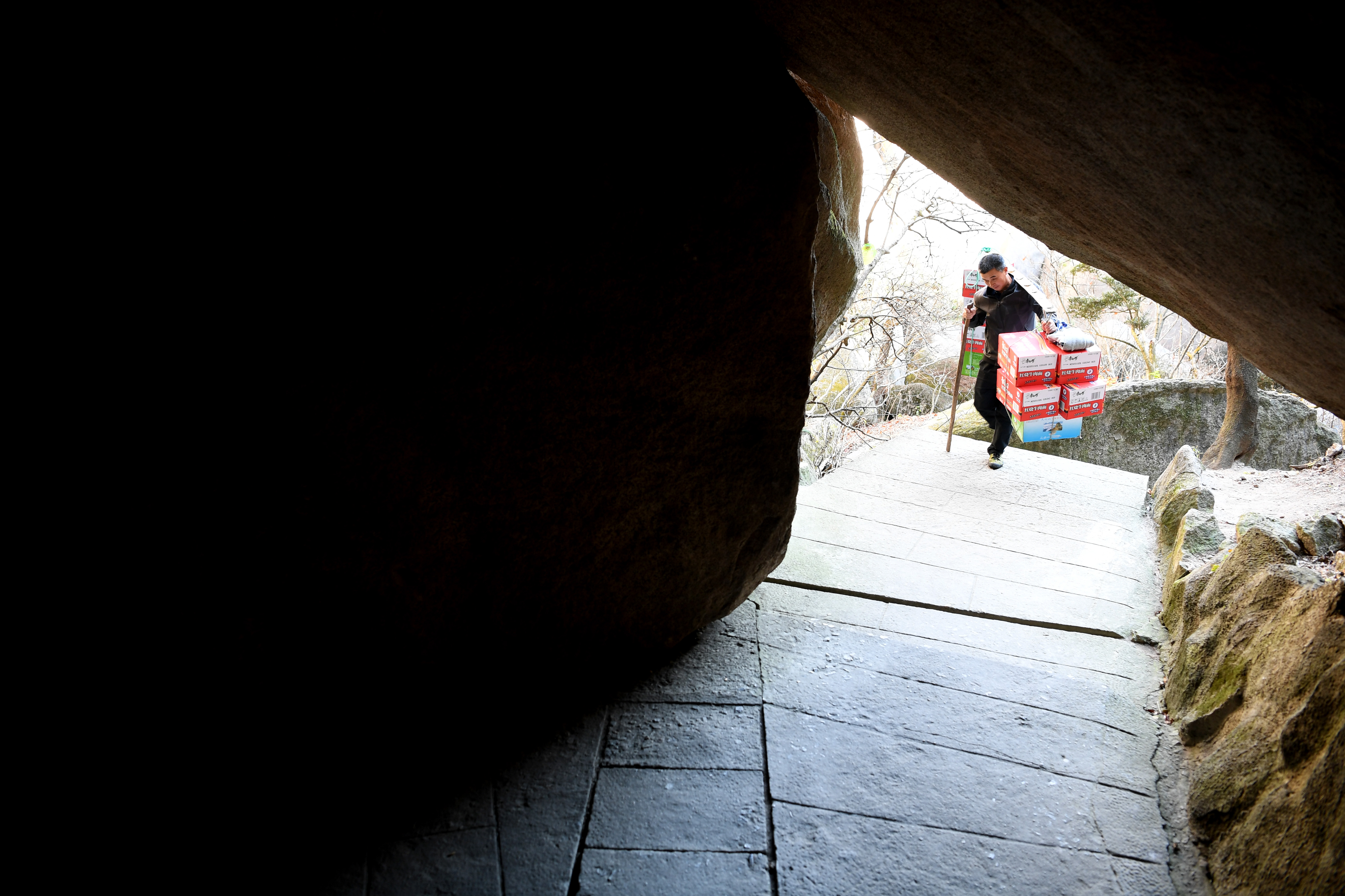 在山上的工作平台,杨月红一待就是大半天,除了期待大量的游客,她还期待遇到做挑山工的丈夫徐胜利。“以前挑建筑材料,现在挑生活物资”,从天柱山振衣岗到天池峰,肩挑约100斤物资,上行1300多级台阶,对于48岁的“资深”挑山工徐胜利来说,并不轻松。一步一个台阶,左右替换肩膀,一趟下来,即使冬天也会大汗淋漓。“再累也要坚持,我知道她在山上等我”,徐胜利最期待的,是登顶之前与杨月红“相遇”。