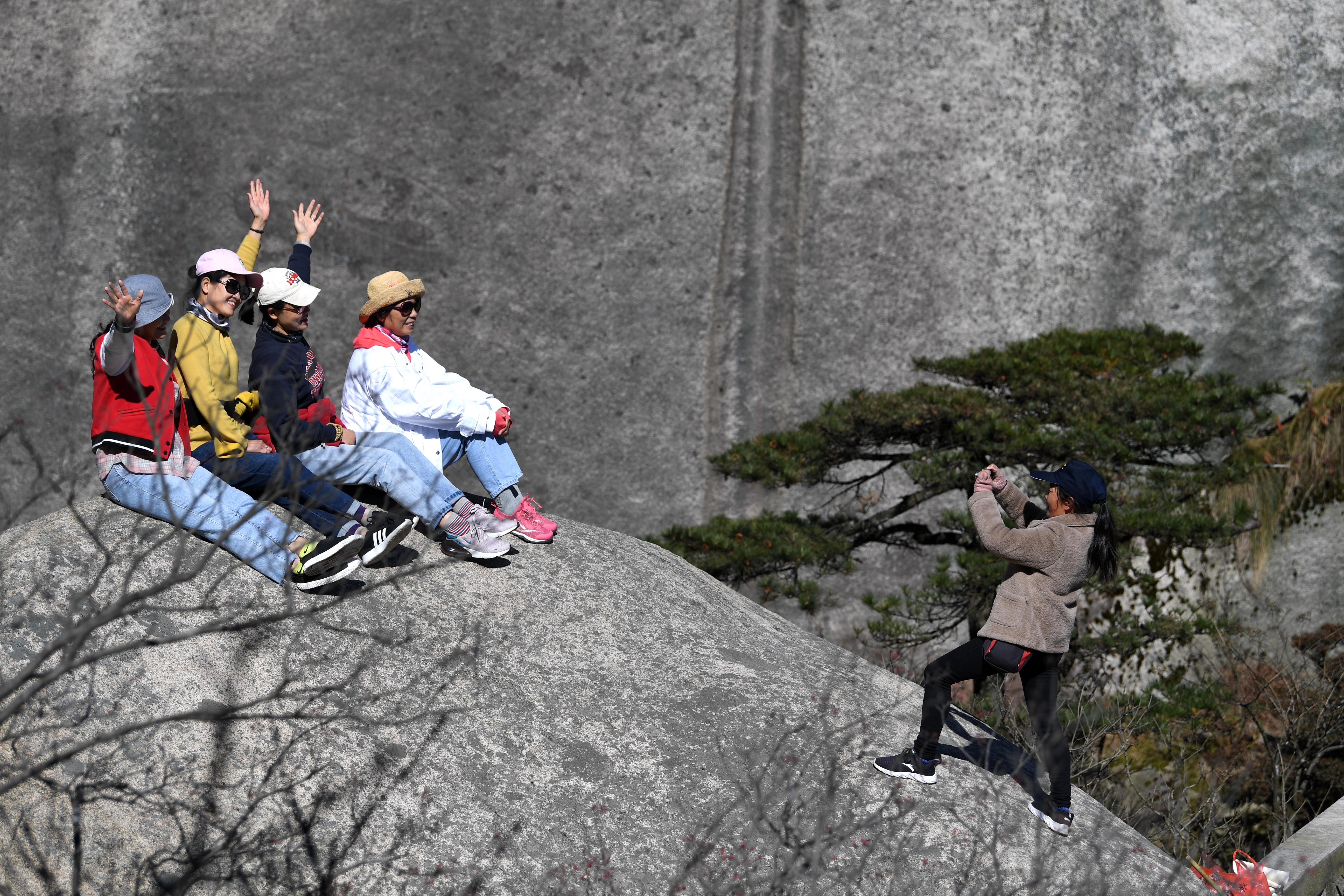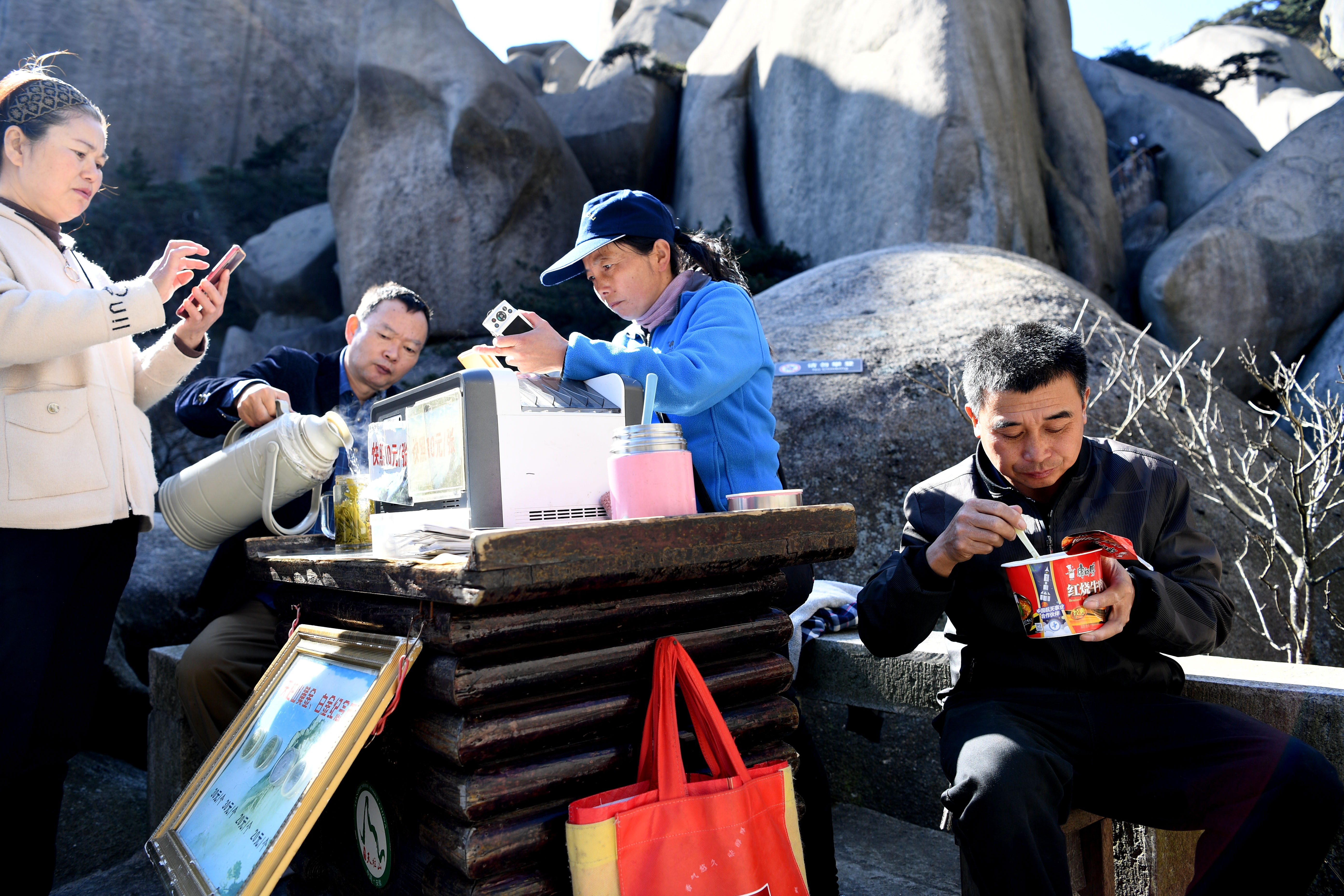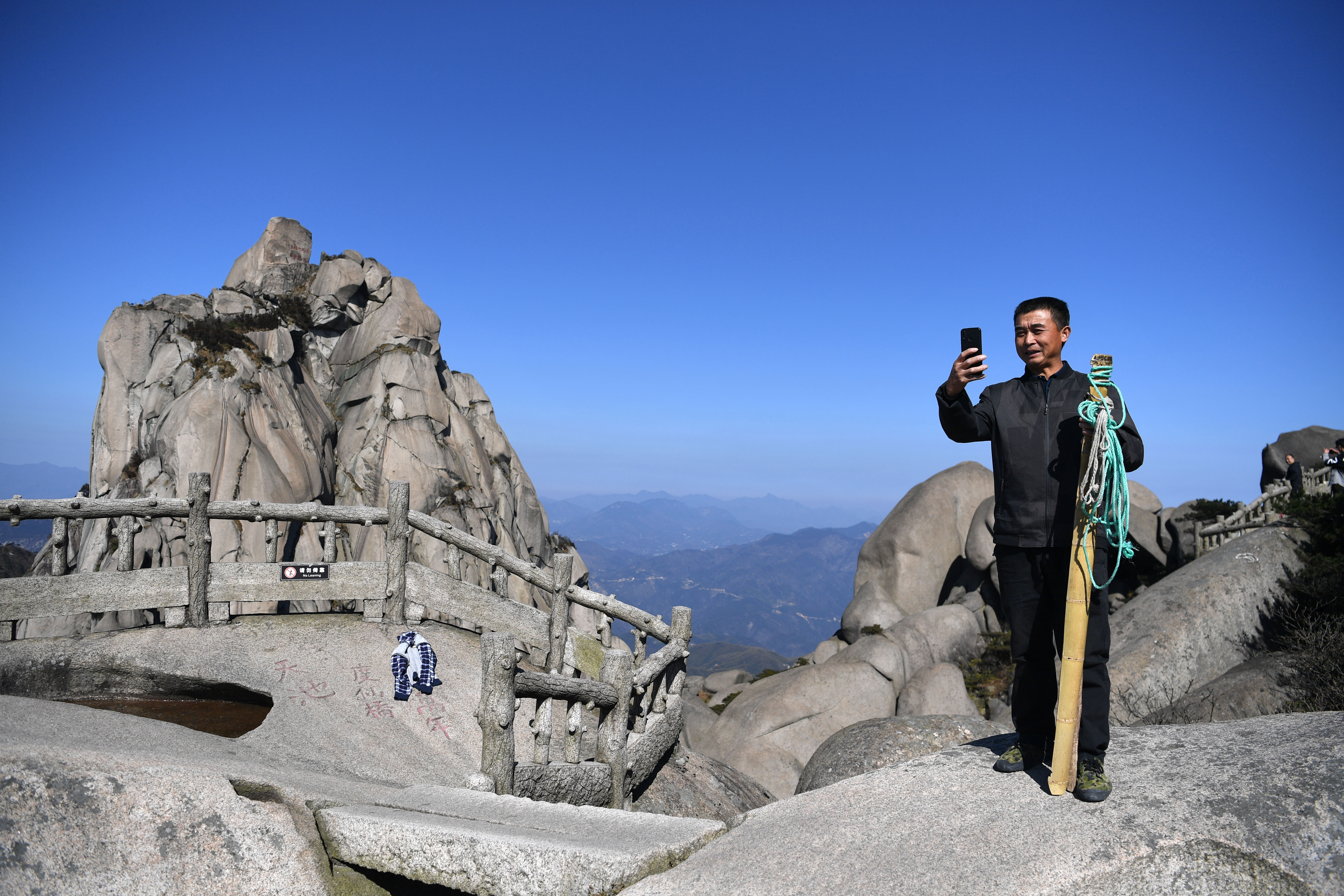 11月13日,徐胜利在天池峰上拍摄视频。每次送货到达峰顶后,徐胜利喜欢拿手机记录天柱山的风光并在朋友圈分享。