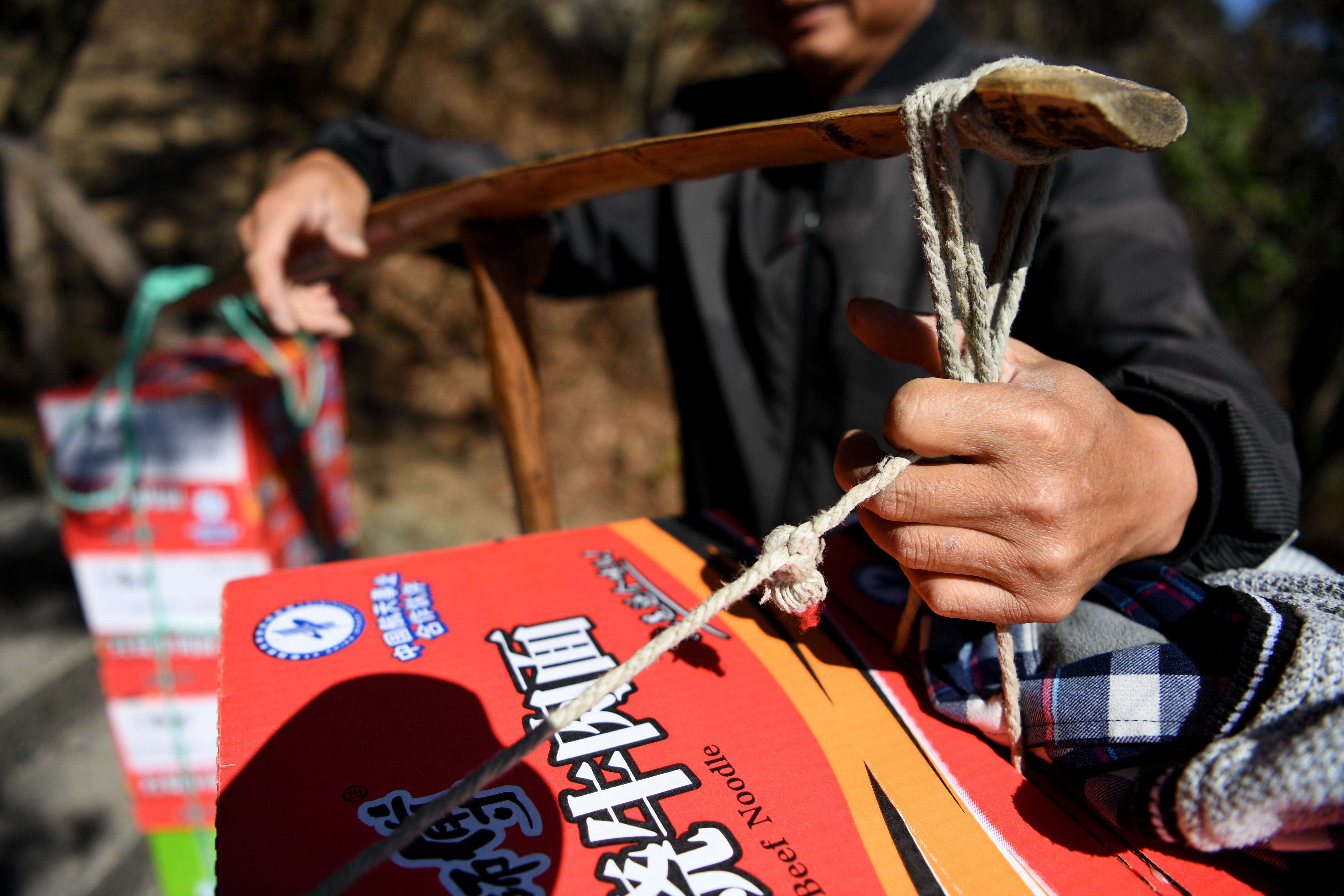 11月13日,徐胜利挑着物资前往天池峰。登山途中,他要紧握绳索,以防物资散落。