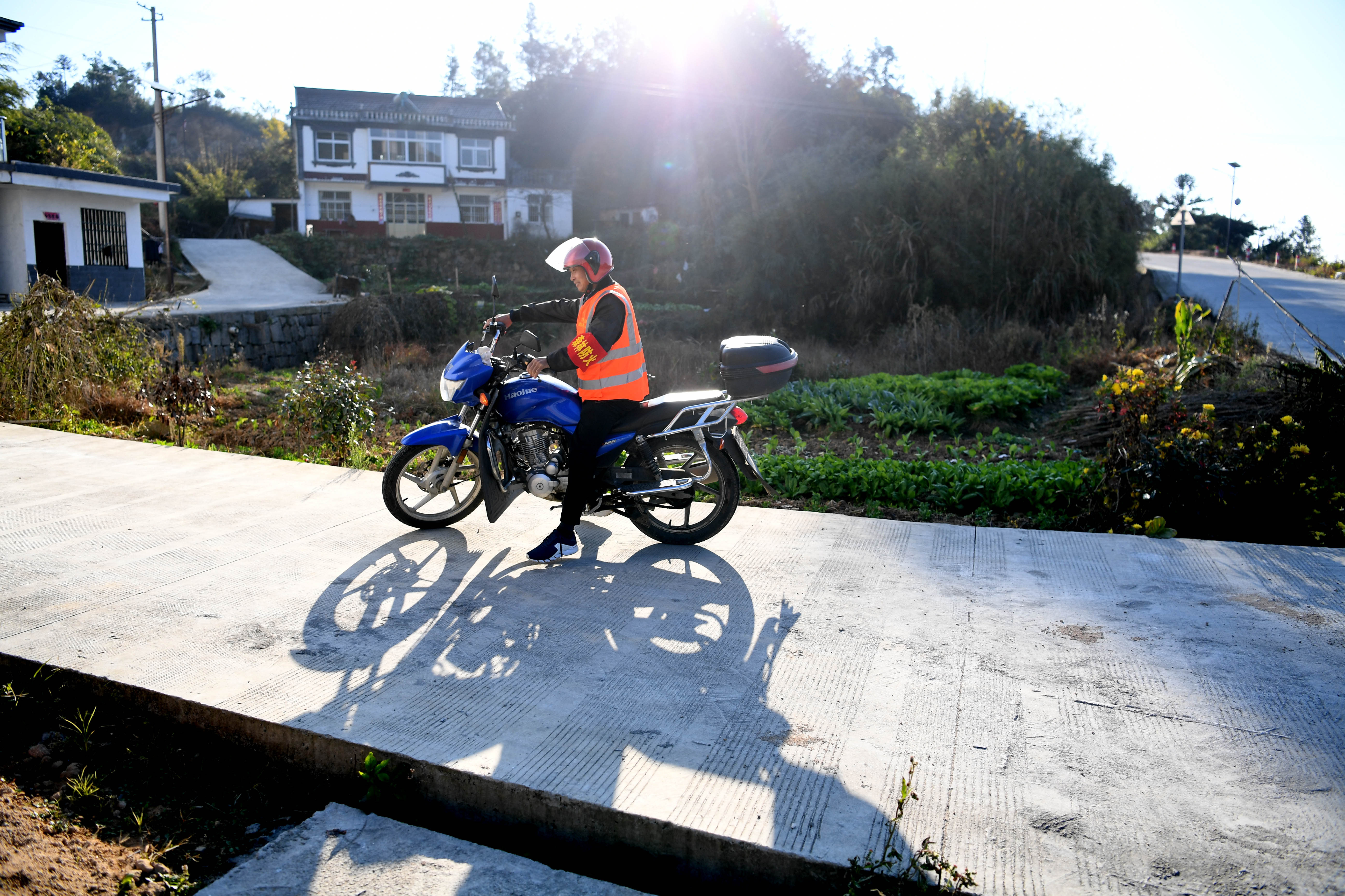 11月14日,徐胜利骑车参加护林工作。2020年,村里为徐胜利提供了生态护林员的公益岗位。