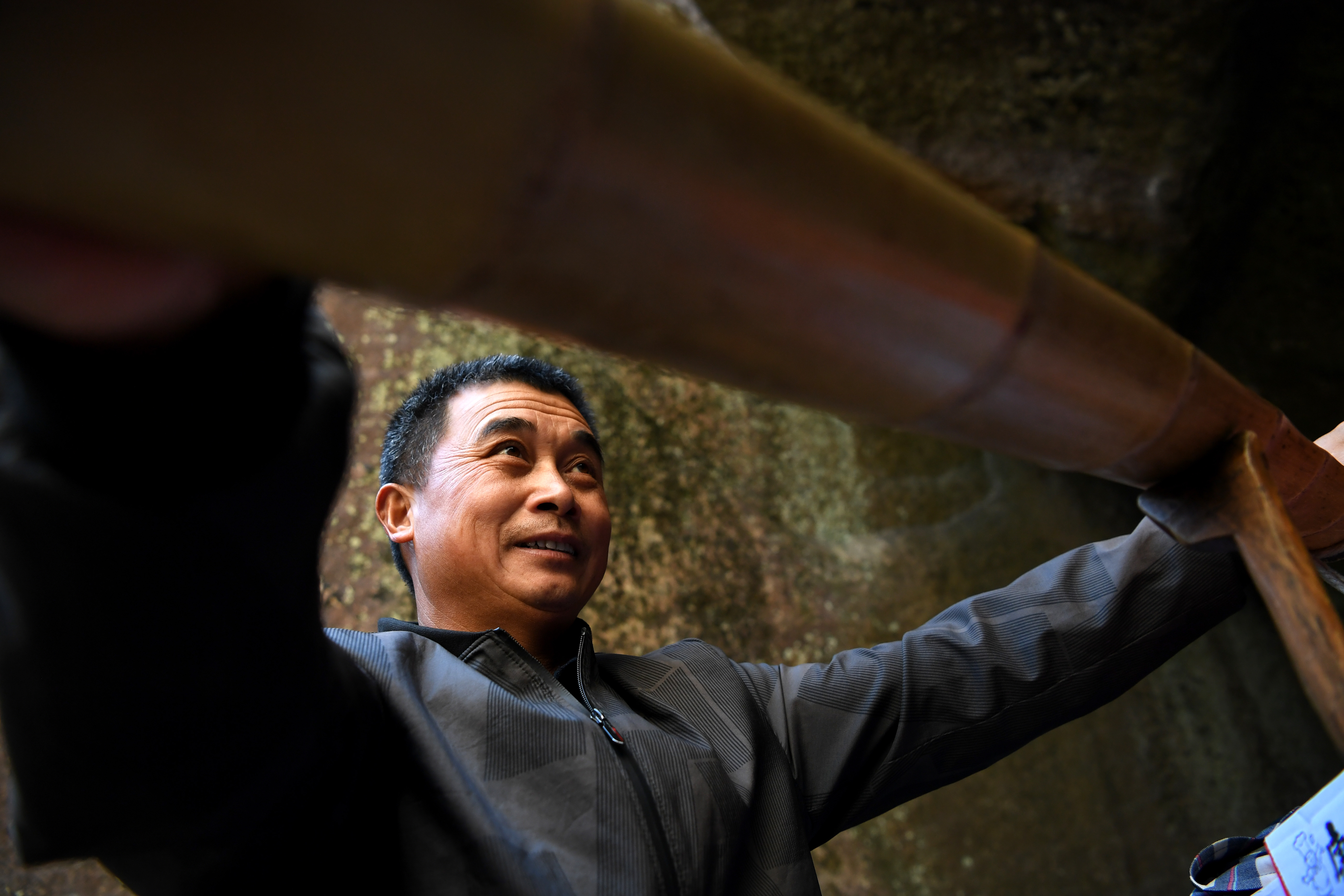 几年前,天柱山大龙窝索道投入使用,山上物资的运输更加便捷,徐胜利“挑山”的工作量减少。不“挑山”的日子里,村里为他安排了山下工地的工作,还聘他为生态护林员。