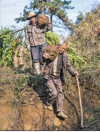 20日,湖北竹山县深河乡麻线村,村民正在运送准备种植的树苗。