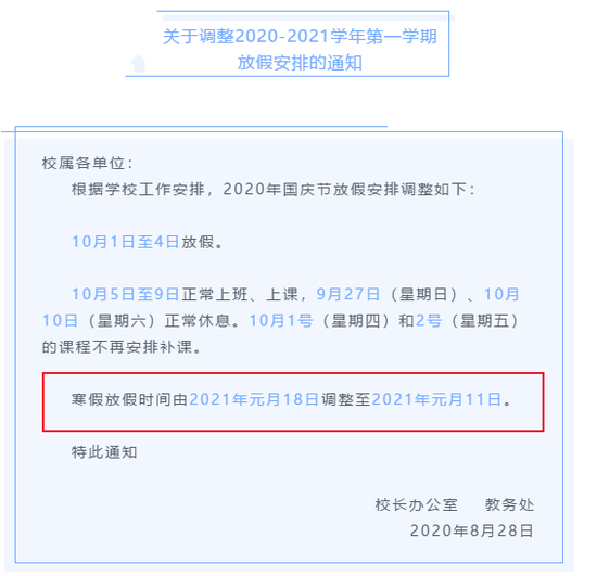此外,长春师范大学将寒假提前一周放假,假期相应延长一周;中南民族大学也将国庆中秋部分节假日调整到寒假中。