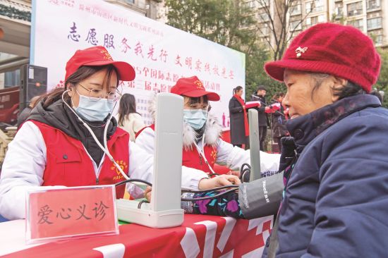 12月3日,爱心义诊志愿者在为居民测量血压。
