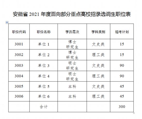 据安徽先锋微讯消息:12月7日,中共安徽省委组织部、中共安徽省委教育工委和安徽省人力资源和社会保障厅联合发布公告,面向19所重点高校选调300名全日制应届大学毕业生,其中,博士研究生30名,硕士研究生180名,本科生90名。具体如下: