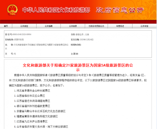 12月16日,文化和旅游部网站发布关于拟确定21家旅游景区为国家5A级旅游景区的公示,安徽省马鞍山市长江采石矶文化生态旅游区位列公示名单之中。
