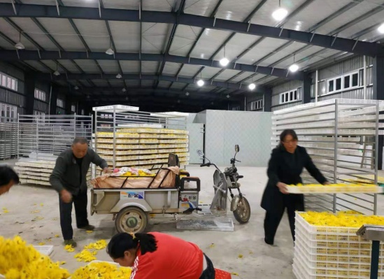罗塘村党总支书记张健心系村扶贫到村项目菊花深加工,夜间率村两委干部到厂加班帮助贫困户出售菊花。