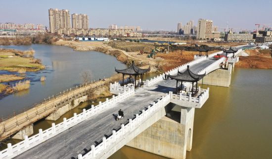 西起遵阳街,东连滨河路,总长462米的慢行系统人行桥——五孔桥工程(京沪铁路至滨河路)1月12日正式完工通行。五孔桥工程是我市为民办实事项目,该桥的通行对于新老城区之间的交互、连通起着积极作用,极大地方便了市民的生产生活。图为1月13日拍摄的已通行的五孔桥。