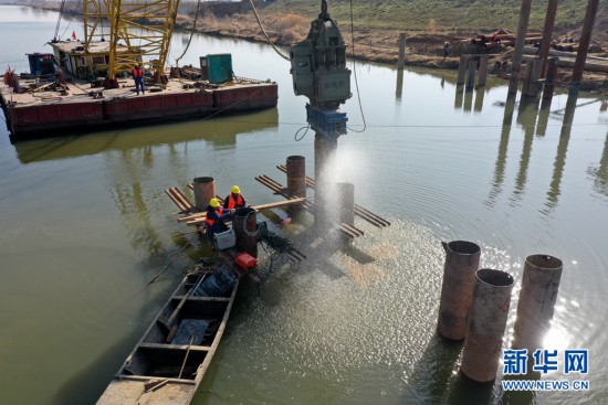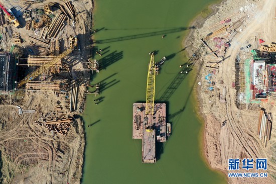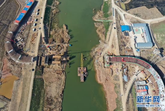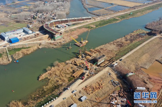 1月18日拍摄的安徽省滁州市全椒县襄河口大桥新建工程施工现场(无人机照片)。新华网发(沈果 摄)