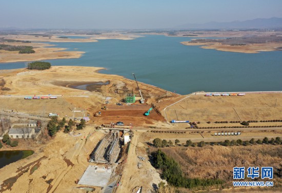1月18日拍摄的安徽省滁州市全椒县马厂水库除险加固施工现场(无人机照片)。新华网发(沈果 摄)