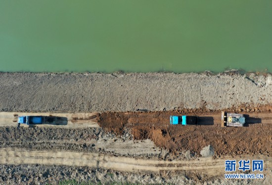 1月18日,安徽省滁州市全椒县如意河左岸,工程车辆正在进行堤防加固(无人机照片)。新华网发(沈果 摄)