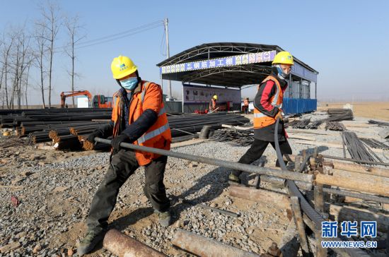 1月18日,安徽省滁州市全椒县荒草三圩进退洪闸工程工地上,工人正在加工钢筋。新华网发(沈果 摄)