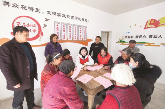 2月20日,在来安县移风易俗示范村桥西村大石牛组的新时代文明实践点内,该镇的青年志愿者正在向村民们倡导节俭过节新风尚。自开展新时代文明实践工作以来,来安县利用小区公益用房、村庄闲置用房,打造“邻里中心”“农家大院”和“居民之家”等新时代文明实践角,开展贴近百姓的新时代文明实践活动。截至目前,全县共建成新时代文明实践角20个。