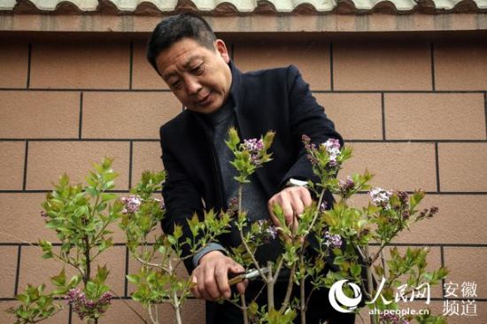 赵发根正在修建自家院子里的绿植。人民网 陶涛摄