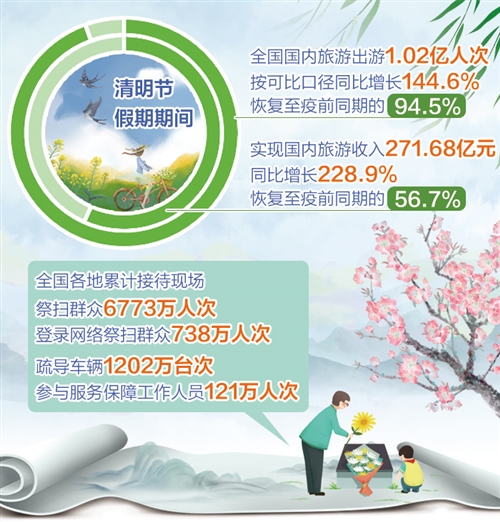 此外,据民政部清明节祭扫工作办公室统计,清明节假期各地累计接待现场祭扫群众6773万人次,登录网络祭扫群众738万人次,疏导车辆1202万台次,参与服务保障工作人员121万人次。