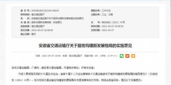 据安徽发布微信号消息:安徽省交通运输厅近日印发《关于服务构建新发展格局的实施意见》,明确提出,加快形成现代化高质量的全省综合立体交通网,加速完善现代交通物流体系,为构建新发展格局提供有力支撑保障。