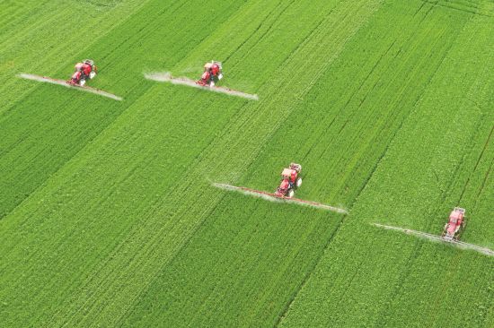 4月14日,明光市潘村镇潘村洼现代农业示范区,农技人员组织开展小麦赤霉病统防统治现场。