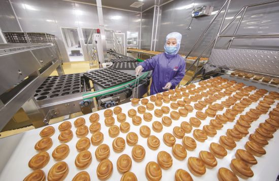 安徽省小岗盼盼食品有限公司位于凤阳县小岗产业园,项目总投资10.6亿元,占地面积280亩,该项目于2017年4月25日开工建设,2018年年底第一条生产线开始投产,截止到2021年3月已投产10条生产线。该企业主要生产法格华夫、饼干、手撕面包和纯蛋糕等产品,有效促进了当地群众就地就业,助力地方经济发展。图为工人在手撕面包生产线上作业。