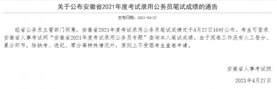 经省公务员主管部门同意,安徽省2021年度考试录用公务员笔试成绩定于4月27日16时公布。考生可登录安徽省人事考试网“安徽省2021年度考试录用公务员专题”查询本人笔试成绩。由于阅卷工作没有人工登分、累分环节,除缺考、违纪、零分等特殊情况外,原则上不受理考生查卷申请。