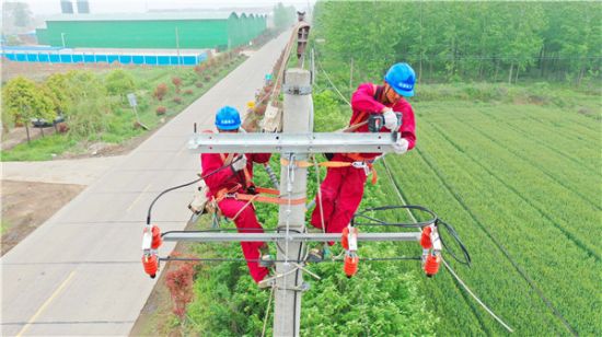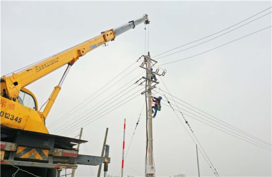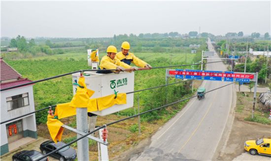 施工人员正在T接苏皖10千伏配网输电线路。滁州供电公司供图
