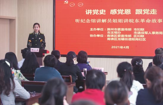 为扎实做好党史学习教育,市委宣传部、市妇联、市文明办、市退役军人事务局共同组织邀请天长、全椒、来安、定远等地革命纪念馆的4位讲解员组成巾帼宣讲团,走出纪念馆,开展“讲党史 感党恩 跟党走”纪念馆讲解员姐姐讲皖东革命故事巾帼大宣讲活动,讲述发生在他们当地的革命战争故事。