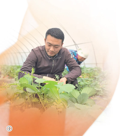 图①:杨伟在草莓大棚里掰叶。本报记者 游仪摄