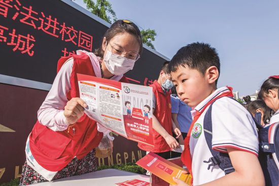 5月31日,南谯区龙蟠小学,志愿者在向小学生们宣传新修订的未成年人保护法。
