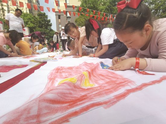 图为20多名儿童围共同创作一幅红色画作。全媒体记者胡文峰摄