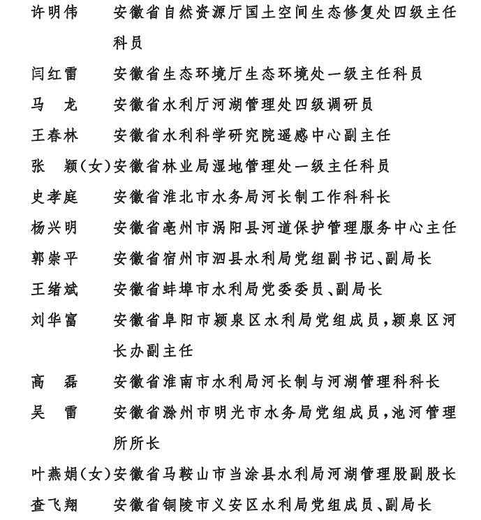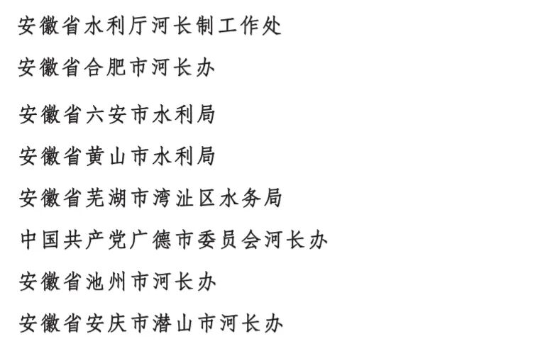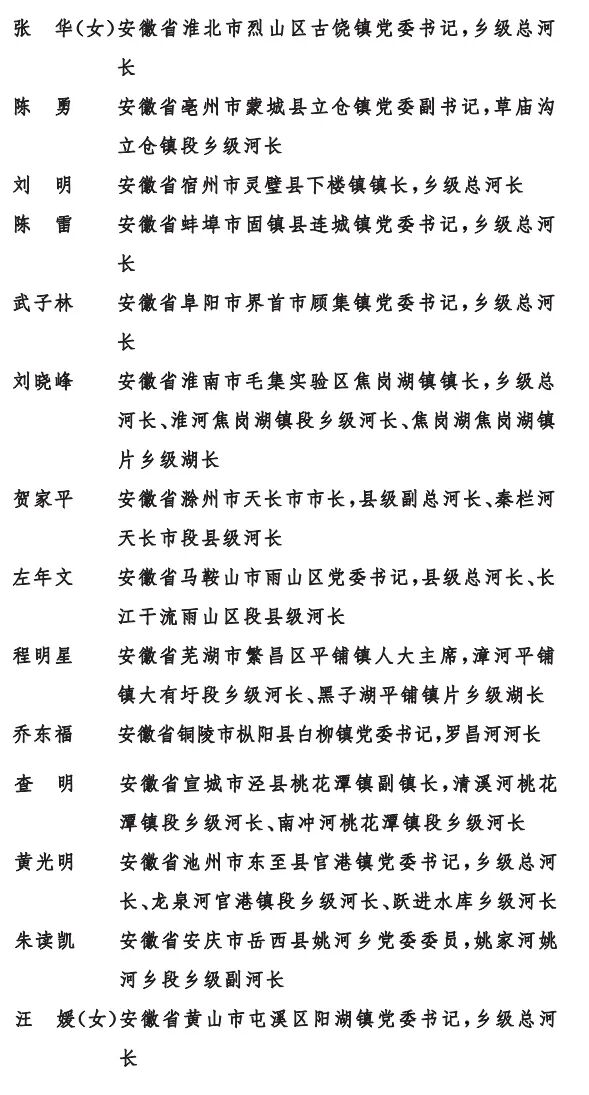 安徽省水利厅河长制工作处等8个单位荣获“全面推行河长制湖长制工作先进集体”;许明伟等14名同志荣获“全面推行河长制湖长制工作先进工作者”;张华等14名同志荣获“全国优秀河(湖)长”。
