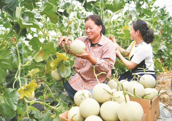 6月9日,在亳州市谯城区双沟镇闫庄村,农民在“特色种养产业扶贫园区”采摘玫珑网纹甜瓜。眼下,当地甜瓜喜获丰收。每棚甜瓜可为村民带来6000多元的经济收入。近年来,谯城区按照“公司+基地+农户”模式,大力发展规模化设施农业。 通讯员 刘勤利 申从珊 摄