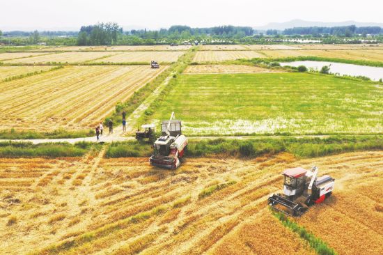 琅琊区农机部门组织调度200余台收割机帮助村民抢收小麦。 特约摄影杨 毅摄
