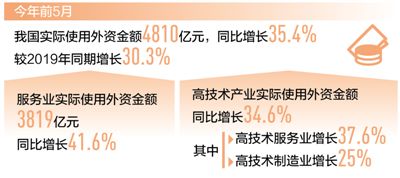 本报北京6月20日电(记者罗珊珊)记者近日从商务部获悉:今年1—5月,我国实际使用外资金额4810亿元,同比增长35.4%,较2019年同期增长30.3%。