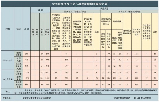 2021年5月,安徽省纪检监察机关共查处违反中央八项规定精神问题286起,批评教育帮助和处理411人,给予党纪政务处分217人。