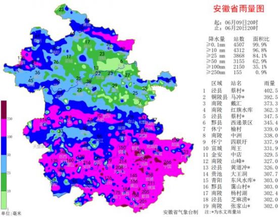 据气象部门观测,今年6月10日入梅以来,我省多降水过程。10到11日雨区主要位于江南和大别山区南部,其中10日池州和黄山市部分地区暴雨,局部大暴雨。12到13日雨区北扩至全省,其中13日淮北地区西部、江淮之间南部和江南东部部分地区暴雨,局部大暴雨;14日雨带北抬,强降水区位于淮北地区北部;15到20日雨带逐渐南压,主要强降水区位于大别山区、江淮南部和江南。
