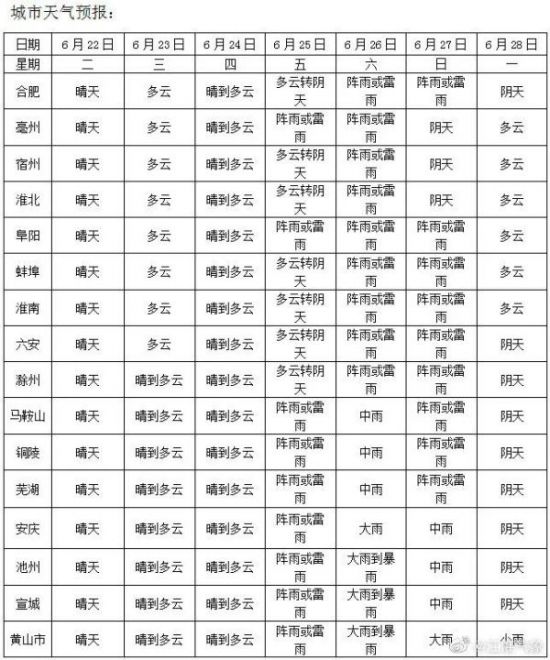 据省气象台最新预报,预计22-24日全省以晴到多云天气为主;25-28日我省南部多降水,其中26-27日大别山区南部和沿江江南部分地区大雨到暴雨,局部大暴雨;我省北部26日前后有一次降水过程。