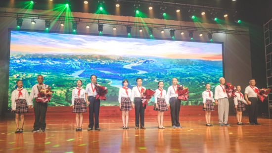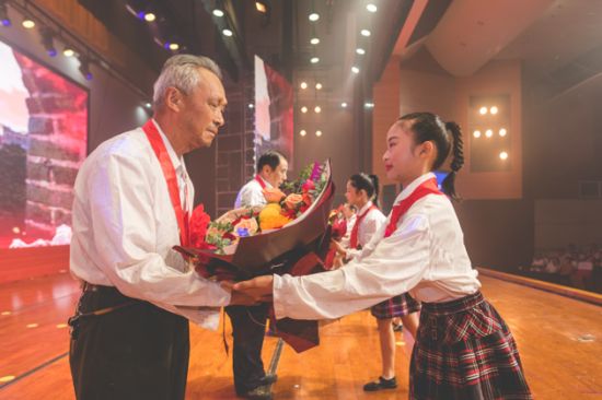 少先队员向获得“光荣在党50周年”纪念章的老党员代表献花