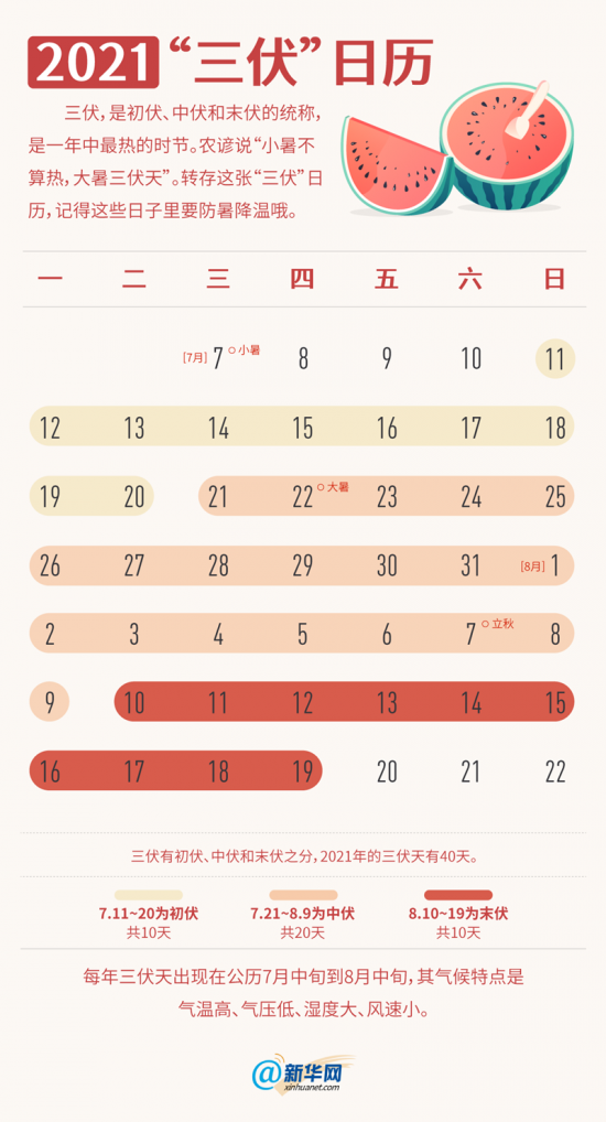 小暑不算热,大暑三伏天,快快收下这张2021三伏日历! 2021-07-13 09:01 新华网 扫描到手持设备 字号: 7月11日,“三伏”大幕正式开启,一年中最热的时候到了。三伏究竟是哪三伏?三伏天的气候特点又是什么?今年三伏有40天,快收下这张2021三伏日历,这些日子别忘了防暑降温。 相关阅读 关键词: 三伏 防暑降温 高温橙色预警:15省区市将现高温天气 江浙皖川渝等地可达40℃2022-08-11 市市场监管局夏日送清凉关爱环卫工2022-08-04 南谯开展“夏送清凉 爱满亭城”文明实践志愿服务2022-07-27 琅琊走访高温一线职工送清凉2022-07-20 工行滁州凤阳支行开展“夏季送清凉”慰问活动 2021-08-17 市琅琊山管委会持续开展“夏送清凉 爱满亭城”慰问活动2021-08-02 菱溪社区开展“夏日送清凉”志愿服务活动2021-07-30 市农业农村局开展“夏送清凉,爱满亭城”新时代文明实践志愿服务活动2021-07-21 扬子街道菱湖社区开展夏季送清凉义诊活动2021-06-30 关爱城乡“美容师”2020-09-04 责任编辑:汤珏 复制网址 打印 收藏 关于我们 | 联系我们 | 加入我们 | 版权声明 | 手机访问 | 网站地图 | 留言反馈 | 我要投稿 中共滁州市委宣传部主办 滁州日报社承办 Copyright?2009-2010 Chuzhou.cn. All Rights Reserved 滁州日报社 版权所有 皖网宣备3412015001号 皖ICP备11004325号-1 热线电话:0550-3022685