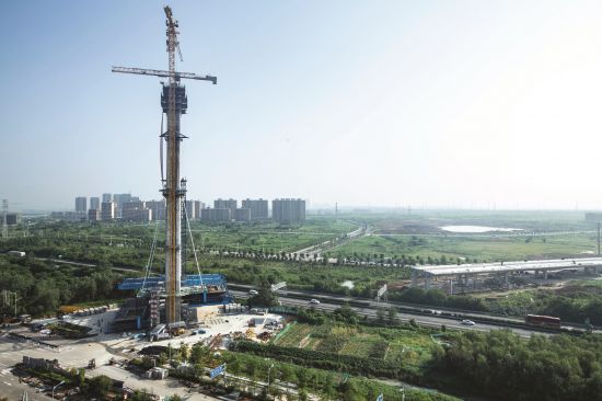 图为嘉山大道跨宁洛高速上跨桥项目主桥主塔封顶施工现场。