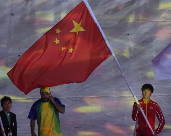里约奥运会闭幕式,中国代表团旗手丁宁(右)进入体育场。新华社记者岳月伟摄