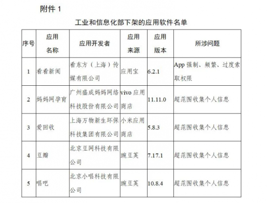 人民网北京12月9日电 (申佳平)据工业和信息化部官方微信公众号“工信微报”消息,近期,工业和信息化部针对APP超范围、高频次索取权限,非服务场景所必需收集用户个人信息,欺骗误导用户下载等违规行为进行了检查,并对未按要求完成整改的APP进行了公开通报。截至目前,尚有豆瓣、唱吧等5款APP未按要求完成整改,依据《个人信息保护法》《网络安全法》等相关法律要求,组织对相关APP进行下架。