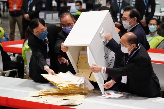 12月19日,香港特区选举管理委员会主席冯骅(右二)打开票箱。新华社记者 吕小炜 摄