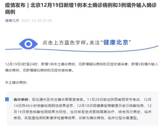 确诊病例:现住通州区宋庄镇华卿画室宿舍。11月28日前往陕西省西安市考试,12月14日持48小时核酸检测阴性结果返京,12月18日因健康宝弹窗提示进行核酸检测,12月19日报告核酸检测结果为阳性,当日转至定点医院隔离治疗,综合流行病史、临床表现、实验室检测和影像学检查等结果,诊断为确诊病例,临床分型为普通型。