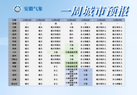 25日(周六):江北多云到晴天;江南阴天转多云。其中大别山区和江南部分地区有小雪。