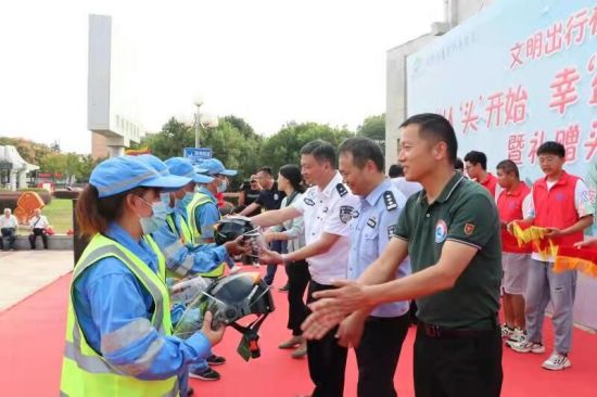 为了倡导驾乘电动自行车规范佩戴安全头盔,文明骑行,增强广大市民的交通安全意识,自觉摒弃交通陋习,持续培养良好的文明出行习惯。9月14日上午,由滁州市公安局交巡警支队牵头,滁州市公安局、市文明办、琅琊区、南谯区、经开区、苏滁高新区、市城管执法局等部门单位,在市人民广场联合举行“文明出行在滁州”(第四季)主题宣传——“从‘头’开始 幸‘盔’有你” 暨礼赠头盔活动。滁州市青年志愿者、道德模范、身边好人、文明家庭、交警、外卖骑手、滴滴代驾、环卫工人代表、滁州技师学院小齿轮志愿者,及部分市民、媒体记者、摄影家等500余人参加了现场活动。