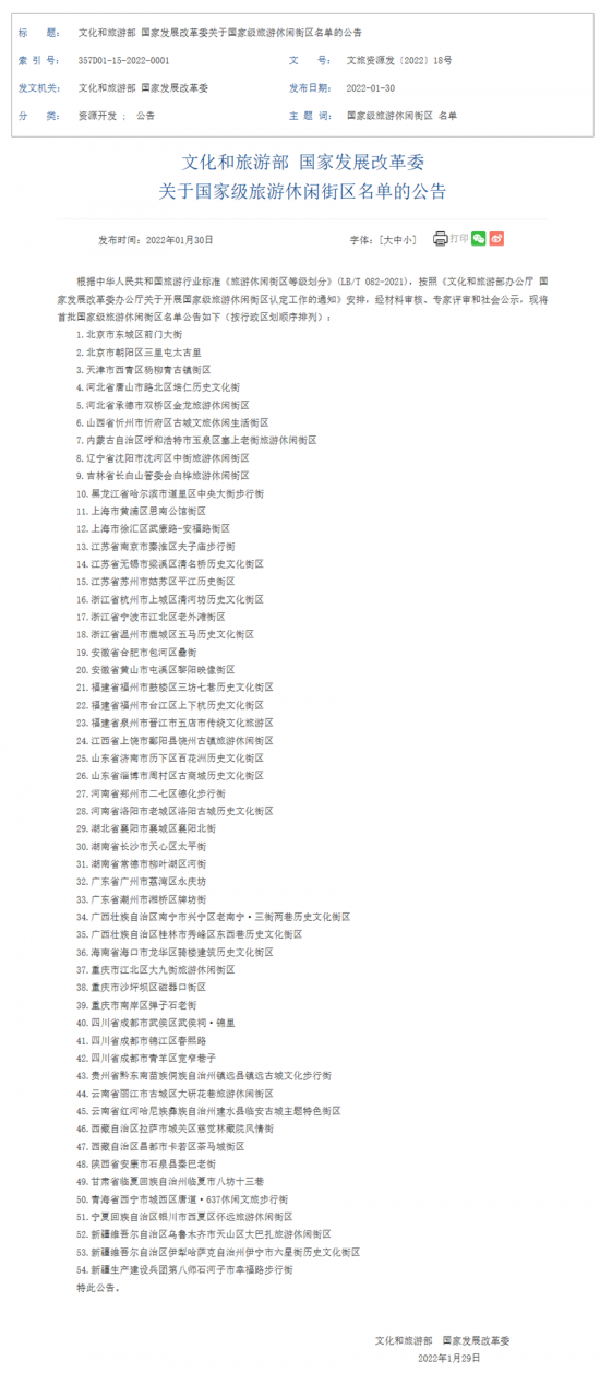 据介绍,首批评选出的国家级旅游休闲街区覆盖全国31个省、自治区、直辖市和新疆生产建设兵团,是在各地300多家省级旅游休闲街区中评出的,代表本地鲜明的文化主题和地域特色,具备旅游休闲、文化体验和旅游公共服务等功能,融合观光、餐饮、娱乐、购物、住宿、休闲等业态,能够满足游客和本地居民游览、休闲等需求。街区旅游公共设施与信息服务体系健全,在全国具有较高的知名度和品牌影响力。