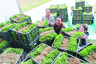 明光市潘村镇,苗农将出售的甜叶菊苗装车。计成军 摄