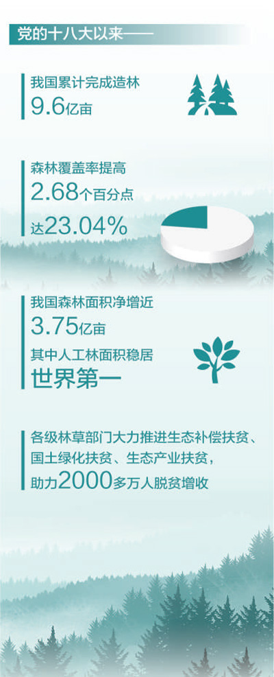 党的十八大以来,我国深入推进国土绿化行动,累计完成造林9.6亿亩