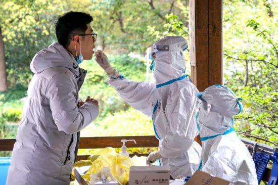 3月28日,浙江大学医学院附属邵逸夫医院支援队的医护人员在浦东昌里小区为居民做核酸采样。新华社发(蒋爱山 摄)