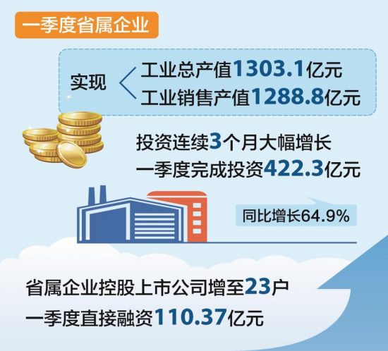 工业稳则经济稳。一季度,省属企业实现工业总产值1303.1亿元、工业销售产值1288.8亿元,同比均增长14.6%,煤炭、有色、化工等几类企业产值增长较快。通过提质增效,一季度省属企业实现利润总额175.6亿元、同比增长10.1%,净利润132.9亿元、同比增长11.9%。28户省属企业有25户实现盈利、22户同比增利,增利面近8成。3月底,省属企业资产总额20275.8亿元,历史上首次突破2万亿元大关,同比增长11.6%;平均资产负债率为57.1%,低于全国省级国资监管企业平均水平14.5个百分点。