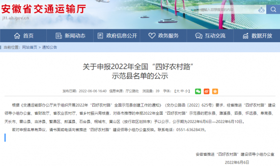 若对申报名单有异议,请书面或电话向省推进“四好农村路”建设领导小组办公室反映。联系电话:0551-63628439。